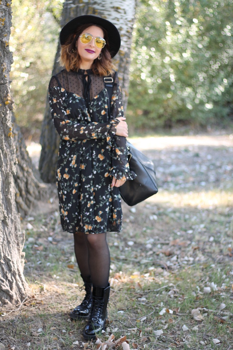La composición es sencilla y fácil de recrear: un vestido con tonos otoñales, unas botas cañeras, un maxi cardigan gordito y gustoso y algún complemento que te apetezca o te identifique, como en mi caso puede ser el sombrero.